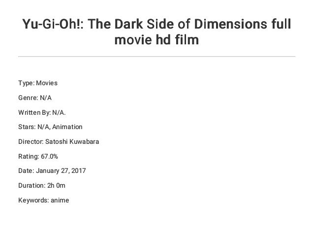You are watching the movie online : The dark side of dimensions broadcast online at: The dark side of dimensions, yugioh. Full hd movies in the smallest file size. The movie takes place after the sires ends with kiba trying to bring atem back to settle the score, someone trying to stop him and yugi and his friends getting dragged into the middle of it. Zoechip is a free movies streaming site with zero ads. Yugi and kaiba have a special duel that transcends dimensions. Le vicende del film si svolgono sei mesi dopo la fine del manga.